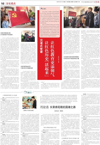 《奠基岁月》红色主题展览是静态展。分为解放天津、接管天津、建立巩固人民政权、建设天津、加强党的建设、完成社会主义改造共六个部分,通过照片、文字、视频与现场解读,生动还原了1949—1956年党的发展历程,通过人物图片与实物,详细记述了当时的天津社会风土人情。文艺党课《奋进》由天津市委宣传部主办,天津北方演艺集团出品,在张园驻场演出。该项目以“喜看新变革”“逐梦赤子心”“追思忆英烈”“脱贫攻坚战”“江山就是人民,人民就是江山”为节目线索,采用数来宝、歌曲、评书、相声等多种观众喜闻乐见的文艺形式,展现了一堂感人至深的沉浸式文艺党课。沉浸式党课《曙光》还原1948年年底天津解放前的民国风貌,从进入张园的那一刻,体验者便开启了时代穿越之旅。这些将党史学习与红色文化互动体验相结合的举措,更好地推动了党史学习教育从“静态”转化为“动态”。