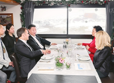 驿站木屋外,春雪纷飞,云海浩渺。两国元首夫妇凭窗而坐,远眺群山,品当地特色美味,论天下风云际会,在轻松愉快的氛围中就一些重要问题进行了战略沟通。