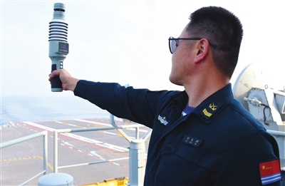 中国海军福建舰上的气象水文部门人员在海上进行人工气象探测。 新华社发