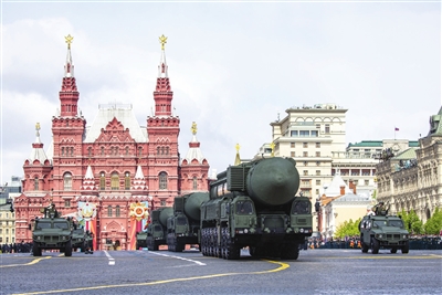 在俄罗斯首都莫斯科,“亚尔斯”导弹系统编队驶过红场。