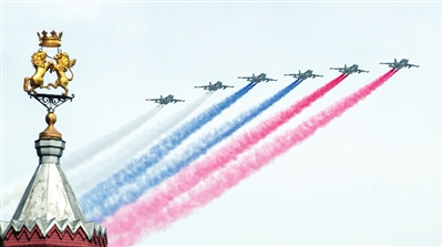 在俄罗斯首都莫斯科,苏-25攻击机编队在红场上空飞过。