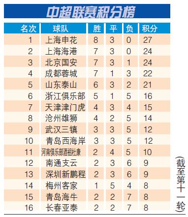 11轮比赛过后,积分榜上第一集团为上海申花队、上海海港队、北京国安队、成都蓉城队、山东泰山队,他们逐渐拉大了与其他球队的积分差距,天津津门虎队暂列第7位。