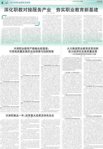 2024年1月1日和3月1日,天津市先后发布实施《天津市职业教育条例》《天津市职业教育产教融合促进条例》,作为地方首修职业教育条例和首部产教融合条例,标志着在教育部支持下,天津职教实现了从政策支持到法律保障的重大飞跃,具有重大示范意义。
