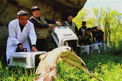 昨天上午,天津市野生动物救护驯养繁殖中心联合黑龙江省小兴安岭野生动物救护繁育研究中心,在黑龙江省小兴安岭九峰山自然保护区,对两地救护的150余只野生动物进行放归。这批动物包括从我市救护的2只草原雕(国家一级保护动物)以及11只赤狐、7只红隼、1只游隼、2只大鵟、 2只普通鵟和1只毛脚鵟(均为国家二级保护动物)等26只野生动物。同时,从当地救护的6只鸳鸯、2只红交嘴雀、3只云雀(均为国家二级保护动物)和110余只三有鸟类也加入了放归。此次放归活动是津黑两地在野生动物异地保护方面的首次合作。