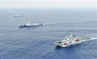 5月17日,中国海警3502编队在南海黄岩岛海域进行舰艇编队运动训练。 新华社发