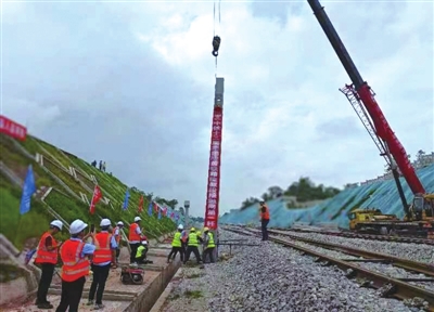 5月21日上午9时28分,隆黄铁路隆叙段施工现场,随着吊车缓缓将接触网杆吊装到位,由中铁十二局集团电气化工程有限公司参建的隆黄铁路隆叙段接触网“第一杆”成功组立,标志着隆黄铁路隆叙段“四电”工程建设顺利启动,全面进入施工阶段。