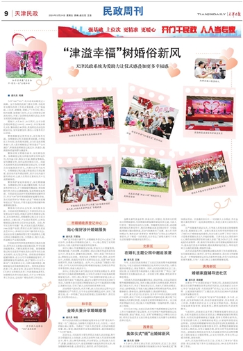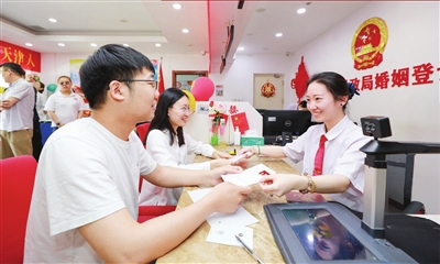 聚焦助力经济社会发展,深化服务创新。市民政局把婚姻登记工作放到经济社会发展全局中谋划,积极打造特色婚姻登记机关,在有条件的区,将婚姻登记机关设立在文旅街区、主题公园、产业园区等场所,以特色婚姻登记服务助力经济社会发展。目前,和平区在和平恒隆广场,河北区在意式风情区、1946创意产业园,西青区在津门湖街乐美宴会艺术中心,津南区在北闸口镇月桥文化仓,北辰区在青光镇韩家墅村墅外桃源婚礼主题公园设立婚姻登记处,方便群众、吸引人流,形成婚庆产业链的集聚。