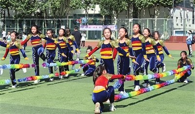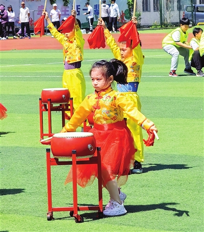 展演现场,来自16所幼儿园和小学共280余名孩子带来的跳皮筋展示拉开了活动帷幕。伴随着欢快的音乐,场上的孩子们挑、勾、踩、跨、摆,将小小一根皮筋摆弄出各式花样。有趣的找朋友、丢手绢,活力满满的民族健身操,别开生面的打花棒,气势十足的中华武术,铿锵有力的中国鼓,步伐灵动的竹竿舞等展演项目陆续上演,让人大饱眼福。观众被中华传统体育游戏的魅力深深吸引,现场不时响起阵阵掌声。