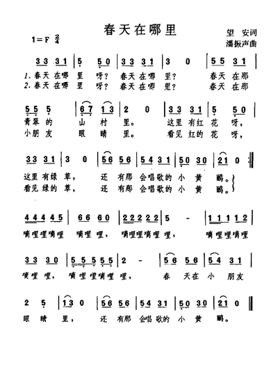 《春天在哪里》:“春天在哪里呀,春天在哪里,春天在那小朋友的眼睛里……”《春天在哪里》又名《嘀哩嘀哩》,由望安作词,潘振声谱曲。这首儿歌创作于上世纪80年代初期。一天,潘振声收到望安寄给他的《春天在哪里》的歌词,认为歌词写得有声有色、有情有景,不仅形式新颖,而且内容有一定深度。于是,潘振声顺着词作者的思路,来到了湖边,和少年儿童交朋友,去了解他们的想法,仅用一个晚上就完成了谱曲。该作品于1981年5月25日刊登于《北京音乐报》,后被选入义务教育三年级下册音乐教材。1992年,此歌曲获得第二届中国金唱片奖。