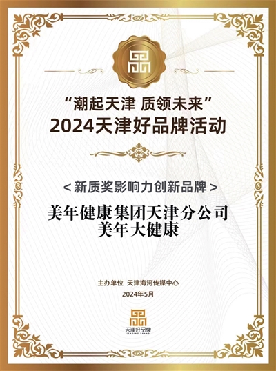 近日,在第八个“中国品牌日”来临之际,权威党媒《天津日报》特别推出“潮起天津 质领未来”2024天津好品牌系列活动,意在展示天津的品牌形象,提升天津品牌的知名度和影响力,为本地经济的发展注入新的活力和动力。经过大众微信投票推选、实地走访调研、专家评分和主办单位评审等多环节筛选,美年健康集团天津分公司旗下品牌美年大健康脱颖而出,获“新质奖影响力创新品牌”荣誉称号,展现了企业的责任与担当,彰显了品牌不断提升服务品质以及服务水平,推进以新质生产力带动品牌建设和城市高质量发展方面作出的积极探索和突出贡献。