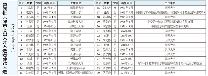 第四批天津市杰出人才评选工作已于日前结束。根据《天津市杰出人才培养项目实施办法》,现将第四批天津市杰出人才入选者建议人选予以公示,公示期为5月31日至6月6日(共计5个工作日)。