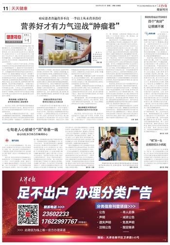 通过营养治疗,可以增强机体免疫力,不仅可增加抗肿瘤治疗的效果,还能提高对手术、放疗、化疗的耐受能力,减少并发症和不良反应的发生,进而改善生活质量、延长生存时间。“但很多人认为营养治疗就是告诉患者怎么吃,吃什么。实际上肿瘤患者的营养治疗是一个涵盖了诸多流程的治疗体系,通过完善的营养评估体系、肠内营养配制技术、能量代谢测定技术、辨证施膳食疗技术等,对不同抗肿瘤治疗阶段的患者,给予个体化营养诊疗。”陈亚军说。营养科作为医院重要的临床科室,不仅有单独的营养门诊,还会参与到其他科室病人的综合治疗中,也是众多危重症病人的康复基础。多年来,市肿瘤医院营养科已经全面参与到医院多学科联合诊疗(MDT)中。营养科医生也深入各个病区,营养医师跟踪患者诊疗全程,让患者的营养治疗由被动变主动。目前该院患者营养筛查率已达90%以上,患者营养风险筛查记录表、营养评估报告、肠内肠外营养医嘱单等营养诊疗文书已经纳入患者病案管理。营养科在市肿瘤医院互联网医院建立了全程营养管理模块,结合患者的营养需求,多层次多途径提供诊疗服务,线上线下结合开展家庭营养治疗。