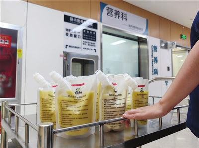 医护人员将刚刚制备完成的营养制剂送到临床科室。 周妍 摄