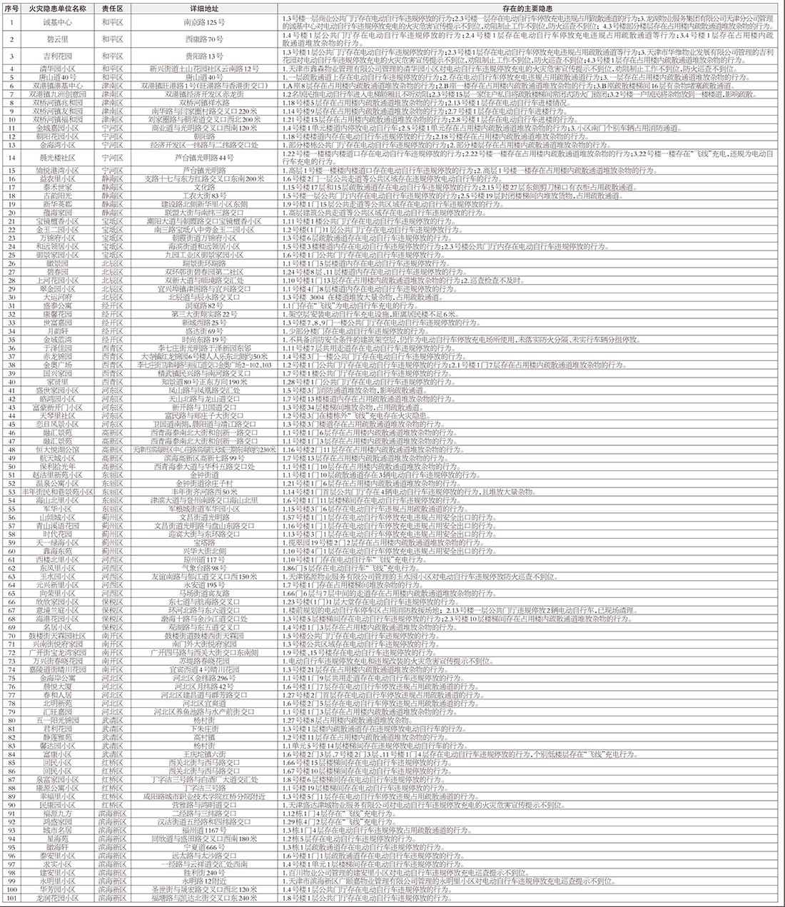 为进一步加强电动自行车安全隐患全链条整治工作,充分发挥媒体和社会舆论监督作用,现曝光101个居民住宅小区消防安全隐患和存在的违法违规行为(2024年6月4日至6月6日),名单如上: