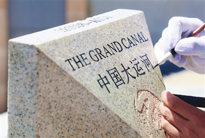 工作人员正在为大运河天津段非遗界碑碑文补漆。