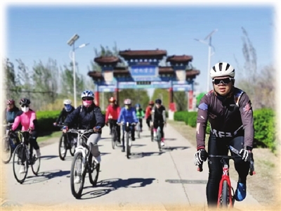 静海陈官屯镇运河东堤,骑行者打卡耕读之村吕官屯。