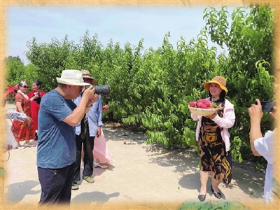 大运河畔的静海陈官屯镇吕官屯村栖霞桃园,游客们采摘打卡拍照。