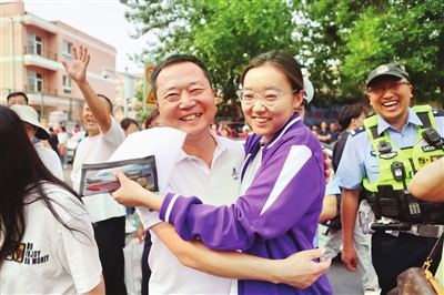 天津中学考场外,家长们为孩子加油打气。