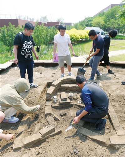 “在校园里建一套实体模拟考古设施,南开大学是首创。”南开大学历史学院副教授李宇奇介绍,位于南开大学历史学院考古实验教学基地的模拟考古发掘池,长宽各6米、地面高度1.1米、地下深度0.4米,模拟了旧石器时代、新石器时代、商周时期等7个不同时期的地层,突出了不同类型的遗迹。难得的是,发掘池里模拟的7个时期地层均由南开大学历史学院师生共同设计、亲手修建。发掘池里特别装填了国内考古工作中常见的夯土、红烧土等土遗迹,让学生体会中国考古工作者在土里找土的田野考古工作过程。发掘池中埋藏的器物均为现代仿制品,地层“发掘”完成后可重新装填、更新遗迹现象,使同学们常“挖”常新。