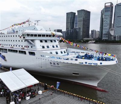 当日,中日国际轮渡有限公司旗下的“鉴真号”轮在上海港国际客运中心码头举行首航仪式。该船是由中国船企自主研发、设计和建造,总长167.2米,型宽25米,载客192人,总吨位约2万吨,设计航速21节。作为一艘非短程国际航行客滚船,该轮定期往返于上海、大阪和神户,除承载旅客外,还可同时装载轿车、载重汽车等。 新华社发