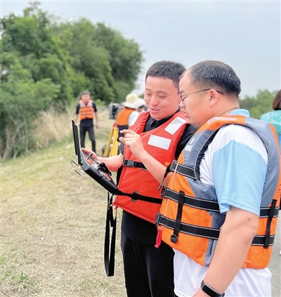 演练现场,无人机悬停于空中,通过定位装置和传感器及时获取水位数据和表面流速。搭载多波束测探仪的无人船在水中缓缓行驶,采集水下地形并在电脑上绘制出水下三维地图。