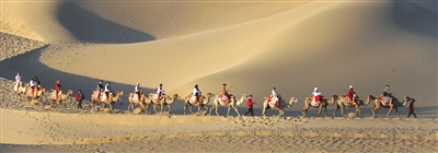 6月9日,游客在甘肃省敦煌市鸣沙山月牙泉景区游览。