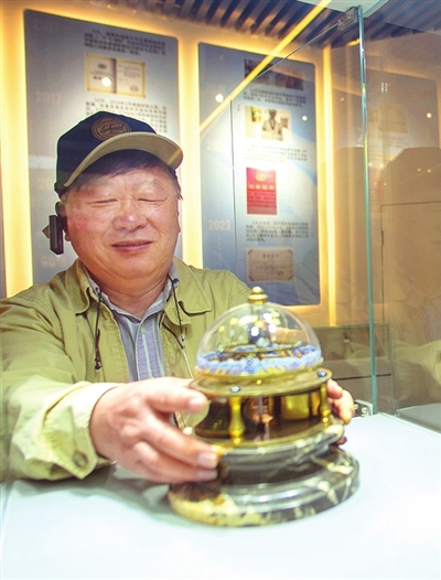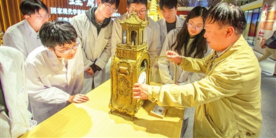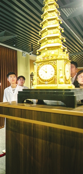 设在天津现代职业技术学院机电工程学院的天津市首批非遗传承体验基地内,陈列着近50台李秋生复刻、制作的钟表,分别代表着清代宫廷钟表制作与修复技艺中的每一道加工工艺。摆在展厅中央的,正是李秋生复刻后的金色九层六角宝塔钟。工作室揭牌后的这几天,展室一直对外开放,不少年轻人走进这里,与拥有百年历史的宫廷钟表进行“对话”。这场穿越之旅的讲解员,便是李秋生。