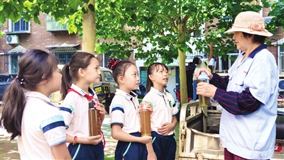 图为泰来东里社区联合集贤里小学将绿豆汤送到环卫工人手中。