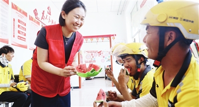 “大伙儿敞开吃啊,西瓜管够。”“吴师傅,我再给您接点水。”昨天15时,户外温度高达37℃,南开区王顶堤街道淦江里社区的户外劳动者驿站里却凉意十足,社区为外卖骑手、快递员、交警等户外劳动者准备了消暑解渴的冰镇西瓜和绿豆汤,让大家在户外劳动者驿站里清凉一“夏”。