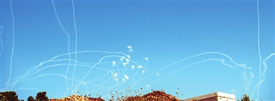 6月12日在以色列北部城市罗什皮纳拍摄的以色列防空系统拦截火箭弹。 新华社发