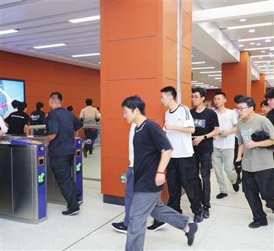 演练模拟末端列车驾驶员室因电气设备短路引发火情,使列车迫停于线路区间,大量“乘客”受困于车厢内,同时因无法动车影响其他列车运行,导致学苑北路站客流积压。演练现场,火灾警报触发后,地铁工作人员快速到达受困车厢安抚“乘客”,就近实施疏散,并在引导逃生时关注“乘客”身体状况,及时开展救助救援和急救措施。同时,车站内轨道运营企业先期处置、区级应急力量参与、市指挥部指挥跨区应急联动,车站外市消防救援总队、市卫健委等市指挥部成员单位和区指挥部成员单位协同配合,各级预案逐步启动,各单位、部门及时响应、分工明确、配合默契,对预设场景应急处置快速得当。