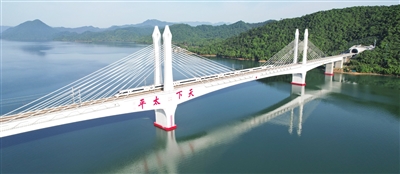 图为6月15日,长三角超级“环线”列车通过位于安徽省黄山市的太平湖特大桥。 新华社发
