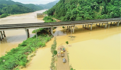 6月16日,在福建南平政和县东平镇,公路部门工作人员在省道302线一处过水路段准备进行抢通作业。