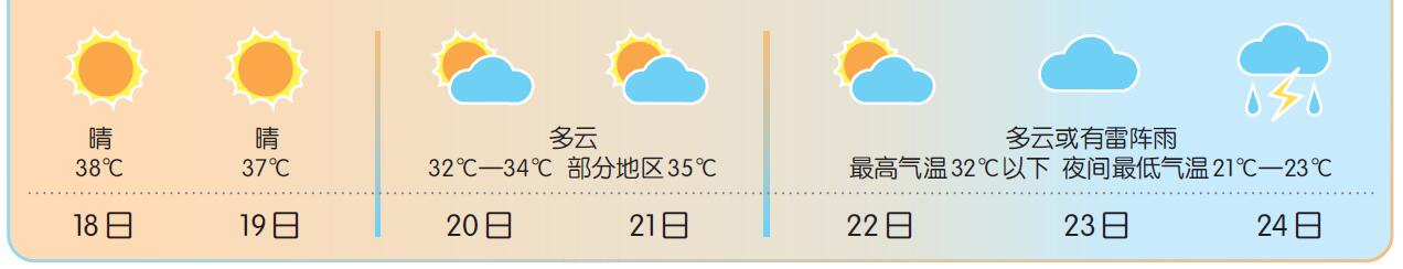 20日到21日,我市将以多云天气为主,最高气温在32℃到34℃之间,部分地区20日最高气温仍为35℃。22日到24日,我市以多云到阴天为主,或有雷阵雨天气过程,届时,最高气温将下降至32℃以下,夜间最低气温也将明显下降,在21℃到23℃之间,夜间清凉回归。