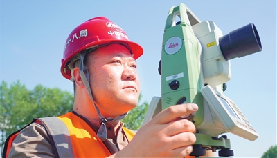 图为烈日下测绘人员现场开展全站仪测设工作。