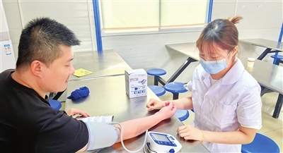 日前,中国铁建大桥局天津地铁8号线延伸线项目联合周边医院开展健康科普义诊活动,现场为建设者测量血压、泡制中药茶饮、中医诊脉等,保障高温天气下户外作业人员的身体健康。 本报记者 张磊 摄