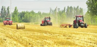 昨天上午,蓟州区杨津庄镇六道街村麦田里,成片的金色麦浪随风摇曳,“蓟州区2024年小麦机收减损技术大比武”的横幅引人注目。阡陌之间,机声隆隆,一台台谷物联合收割机在农机手的熟练操作下按照既定路线有序驶入麦田,留下一行行整齐的麦茬。随后,打捆机上阵“奔波”,在田间收集麦秸,每跑1亩地就从后面“吐”出一捆400斤左右重、绑成圆柱形的麦秸捆,麦田也看上去瞬间“清爽”了不少。目前,蓟州区各镇乡正加紧组织抢收抢种,确保成熟一块、收获一块、归仓一块,做到应收尽收。