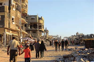 6月17日,在加沙南部城市汗尤尼斯,人们穿行在遭以军袭击后的建筑废墟间。 新华社发