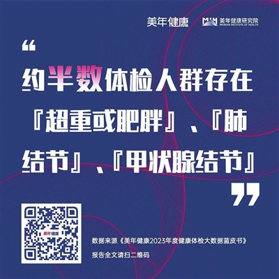 《蓝皮书》显示,体检异常结果检出率前五名依次为:肺结节(54%)、超重肥胖(51%)、甲状腺结节(48%)、脂肪肝(39%)、幽门螺杆菌感染(34%)。也就是说报告中一半体检人群存在超重、肺结节、甲状腺结节情况。