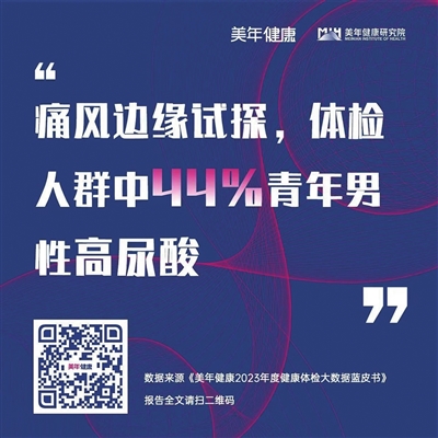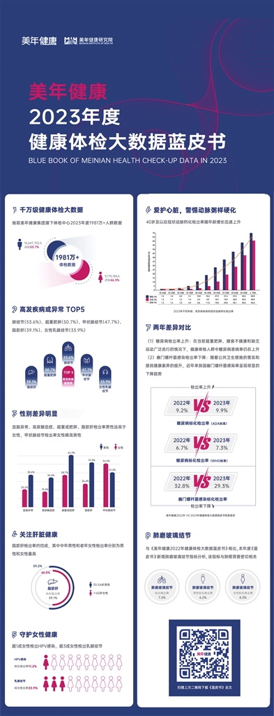 《蓝皮书》数据来源于美年健康2023年度近600家体检中心抽取的样本,样本量为1981万,覆盖全国31个省、自治区和直辖市,以劳动力人口为主要分析对象。聚焦于心血管健康、内分泌健康、呼吸健康、消化健康与泌尿生殖健康五大领域,主要涵盖高血压、糖尿病、肺结节、脂肪肝、肾结石、HPV感染等总计18项疾病或异常指标。