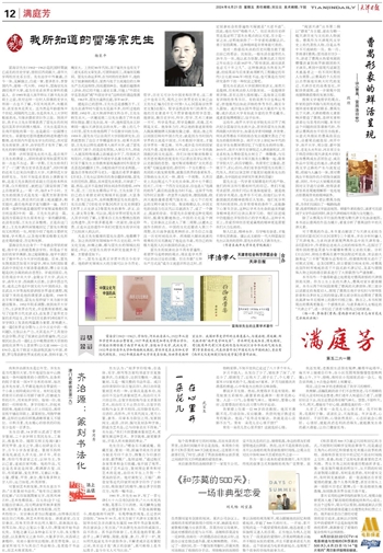 本书另外一个值得称道之处便是对曹禺浓郁的天津情怀的关照。作为土生土长的天津人,曹禺对家乡感情颇深。本书从两个时间段展现了曹禺的天津情怀:第三部分以话剧史的角度切入,展现了曹禺在南开学校时与导师张彭春和众多好友之间的情谊;第五部分则生动展现了曹禺在离津50年后精神上的落叶归根之情。换言之,本书所展现出的曹禺更像是一个感情充沛、与诸多海河儿女相近的“天津之子”,进一步拉近了读者与曹禺之间的距离。