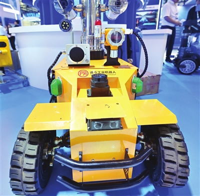 最爱巡检的机器人 河北展区中信重工的防爆轮式巡检机器人,功能是巡检天然气泄漏。