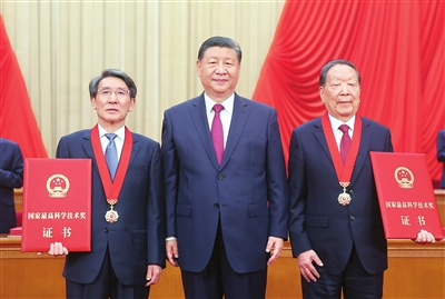 6月24日,全国科技大会、国家科学技术奖励大会和中国科学院第二十一次院士大会、中国工程院第十七次院士大会在北京人民大会堂隆重召开。中共中央总书记、国家主席、中央军委主席习近平向获得2023年度国家最高科学技术奖的武汉大学李德仁院士(右)和清华大学薛其坤院士(左)颁奖。 新华社记者 鞠鹏 摄