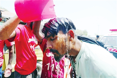 6月26日,在巴基斯坦南部城市卡拉奇,一名男子在路边用凉水浇头消暑。 连日来,极端高温天气持续影响巴基斯坦大部分地区,许多民众因天气炎热患病,到医院接受治疗。 新华社发