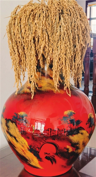 家里的客厅里摆着个红色花纹的大瓶,抬眼望去,很是鲜艳。大瓶中间图案为小桥流水,小桥两侧排列着间距相依的五棵树,茂盛的树冠升腾着花环,活灵活现。山水相间的底色之外,瓶口上总要插上各具特色的假花来粉饰自然,虽然带来些生机、营造了热闹的气氛,但总觉着不接地气,好像走路没有根底,唤不起乡愁,与瓶面上的底色不相协调。