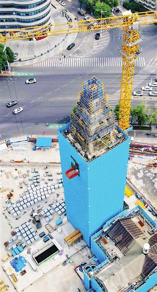 昨日,五大道公园项目标志性钟楼顺利结顶。 本报记者 吴迪 摄