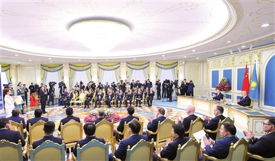 当地时间7月3日中午,国家主席习近平同哈萨克斯坦总统托卡耶夫在阿斯塔纳总统府共同出席阿斯塔纳中国文化中心、北京哈萨克斯坦文化中心和北京语言大学哈萨克斯坦分校揭牌仪式。 新华社记者 庞兴雷 摄
