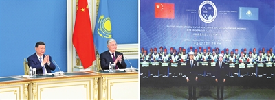 当地时间7月3日中午,国家主席习近平同哈萨克斯坦总统托卡耶夫在阿斯塔纳总统府以视频方式共同出席中欧跨里海直达快运开通仪式(拼版照片)。 新华社记者 殷博古 翟健岚 摄