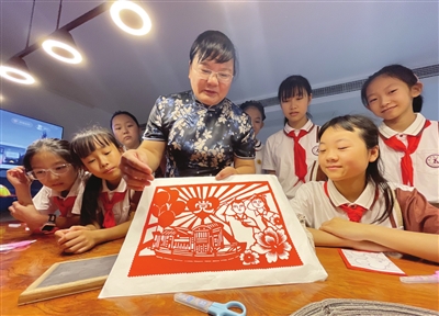 近日,和平区昆明路小学师生来到五大道文化旅游区开展“精彩假日”红领巾夏令营活动,师生参观了“刘氏传统剪纸作品展”,非遗传承人还专门为孩子们创作了红色主题作品《童心向党》。