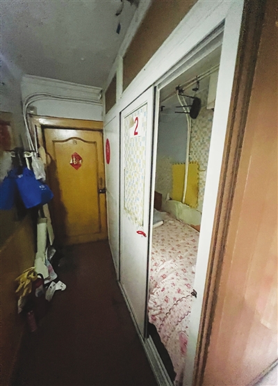 中介带着记者来到一户三楼老式偏单内,此时外面阳光明媚,单元房内则漆黑一片。“这屋子没窗户吗?”中介在墙上摸索了一下,一个吊着电线的灯泡亮了,昏暗的灯光下,一条一人宽过道展现眼前。拉开通道一侧的一扇门,里面露出一张床,“这个2号屋30元一天”。所谓的2号屋看上去更像一个橱柜,床头挂着接线板和一个灯泡。借着昏暗的灯光,记者看到整个单元房里共有六个推拉门,上面都有编号,最大的是6号屋。中介又拉开1号屋的门,“这个也是30元一天,优点是离空调近,缺点是门只能开一半,上床爬着进”。目测1号屋长不足2米,宽0.7米左右,推拉门只能开一半,门锁是一根绳子。